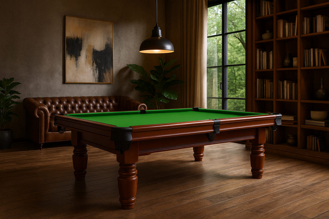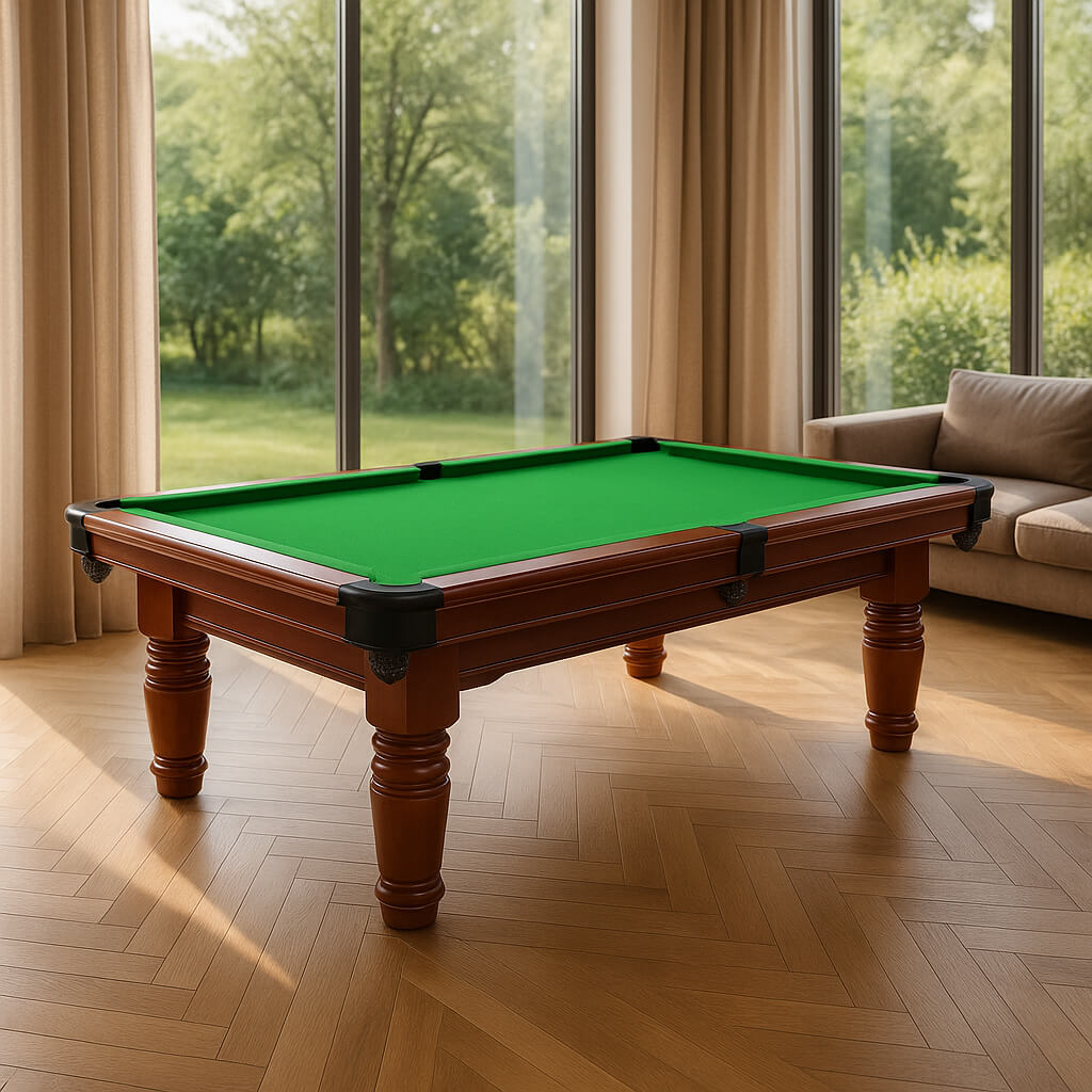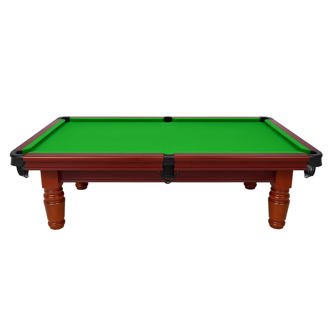 AUREX 7FT Professional Slate Pool Table – Classic Walnut Edition Overview The AUREX 7FT Professional Slate Pool Table combines timeless craftsmanship with professional performance. Built from solid walnut timber and a precision-ground slate bed, it offers smooth, consistent play and elegant style — ideal for both serious players and modern home game rooms. Features Elegant Walnut Timber Frame Crafted from premium solid walnut with a satin finish, the frame and legs deliver a warm, classic aesthetic that suits both traditional and contemporary interiors. Professional Slate Surface Equipped with a 20mm thick precision-ground slate bed, providing superior flatness and ball roll consistency for tournament-level performance. High-Speed English Felt Fitted with single-sided high-speed English felt, designed to maximize playability and durability for professional gameplay. Stable & Reinforced Construction Solid oak frame with reinforced legs and silver height-adjustable levellers ensures perfect balance, exceptional stability, and zero wobble during play. Complete Accessories Kit Included Comes with two 57-inch wooden cues, a full set of 2-inch balls, triangle rack, and cue chalk — ready to play straight out of the box. Dimensions & Specifications • Table Size: 210cm × 126cm (Approx. 7FT × 4FT) • Playing Surface: 190cm × 104cm • Height: Adjustable 83–86cm • Slate: 20mm thick, 3-piece solid slate bed • Gross Weight: 146kg Additional Information • Assembly required; installation and leveling recommended for best results. • Custom tablecloth color service available upon request.