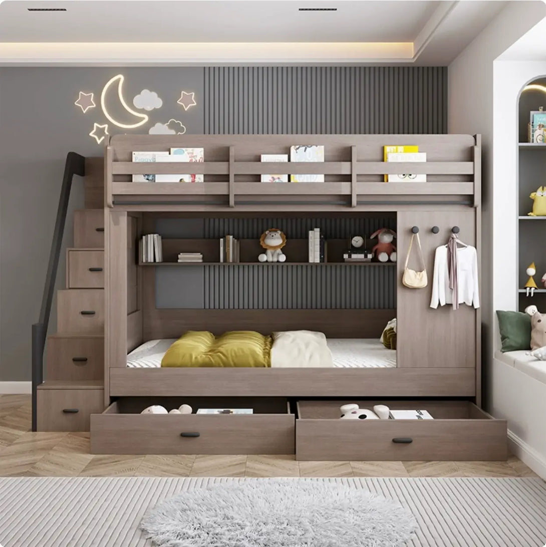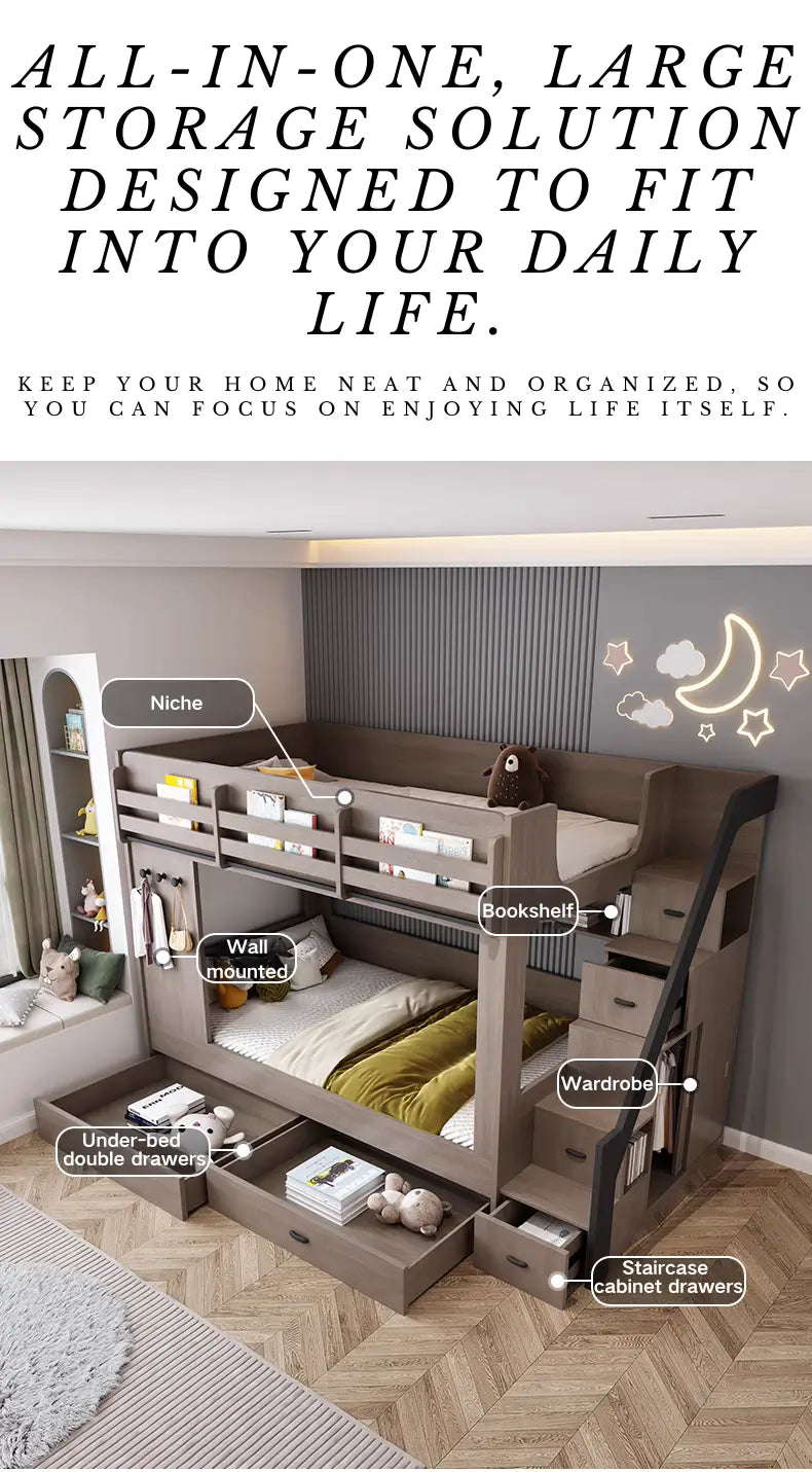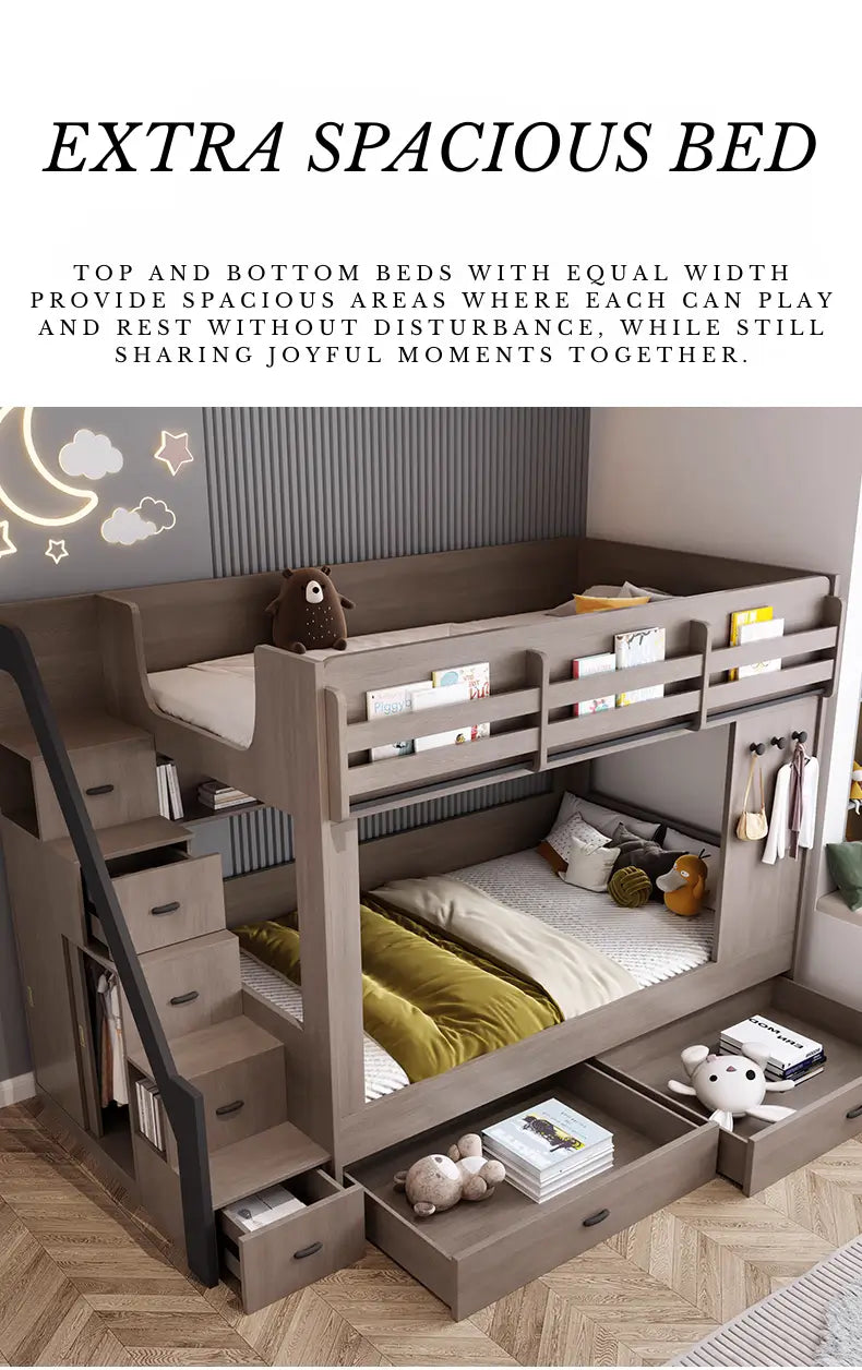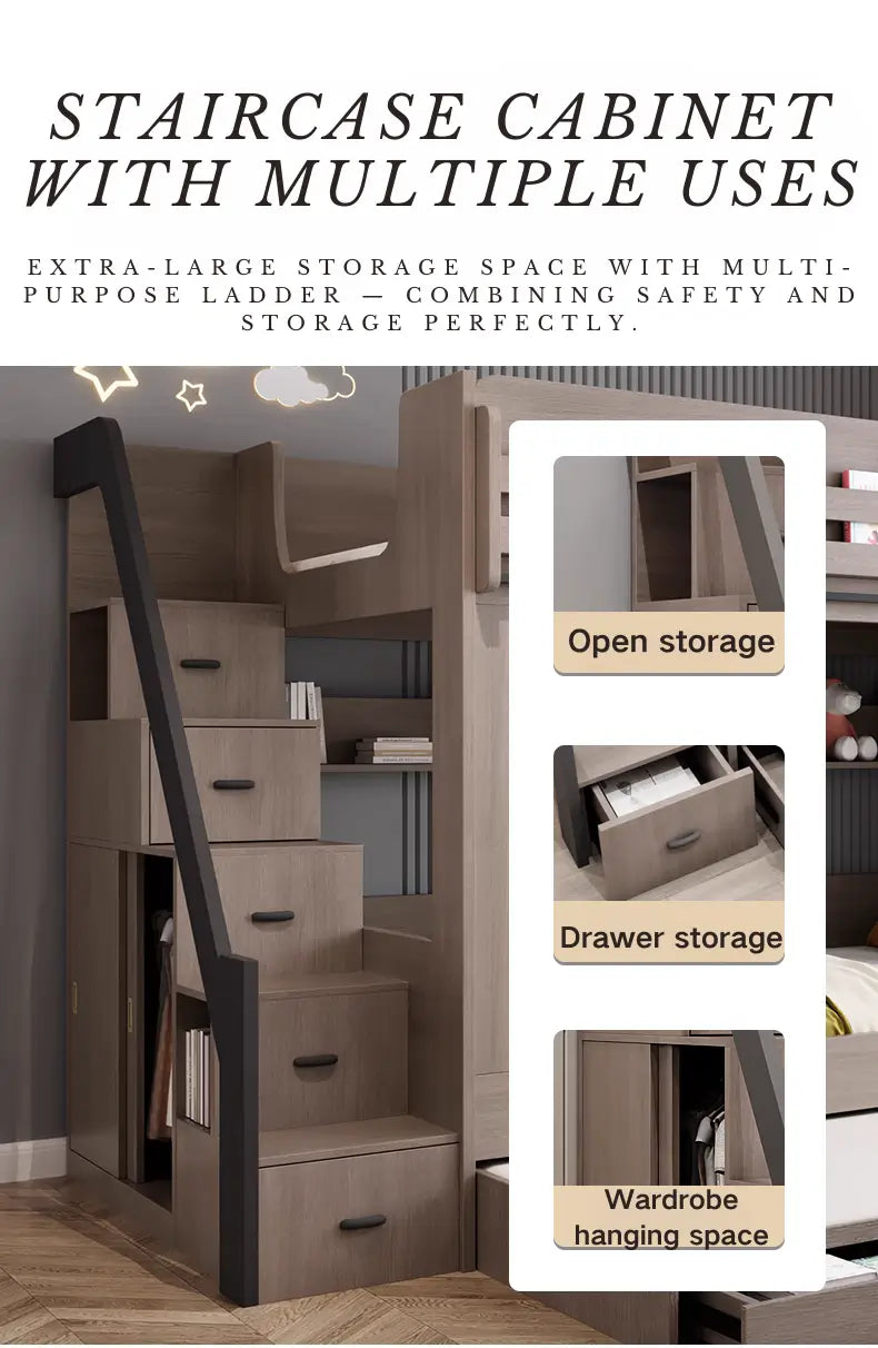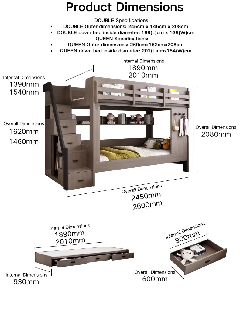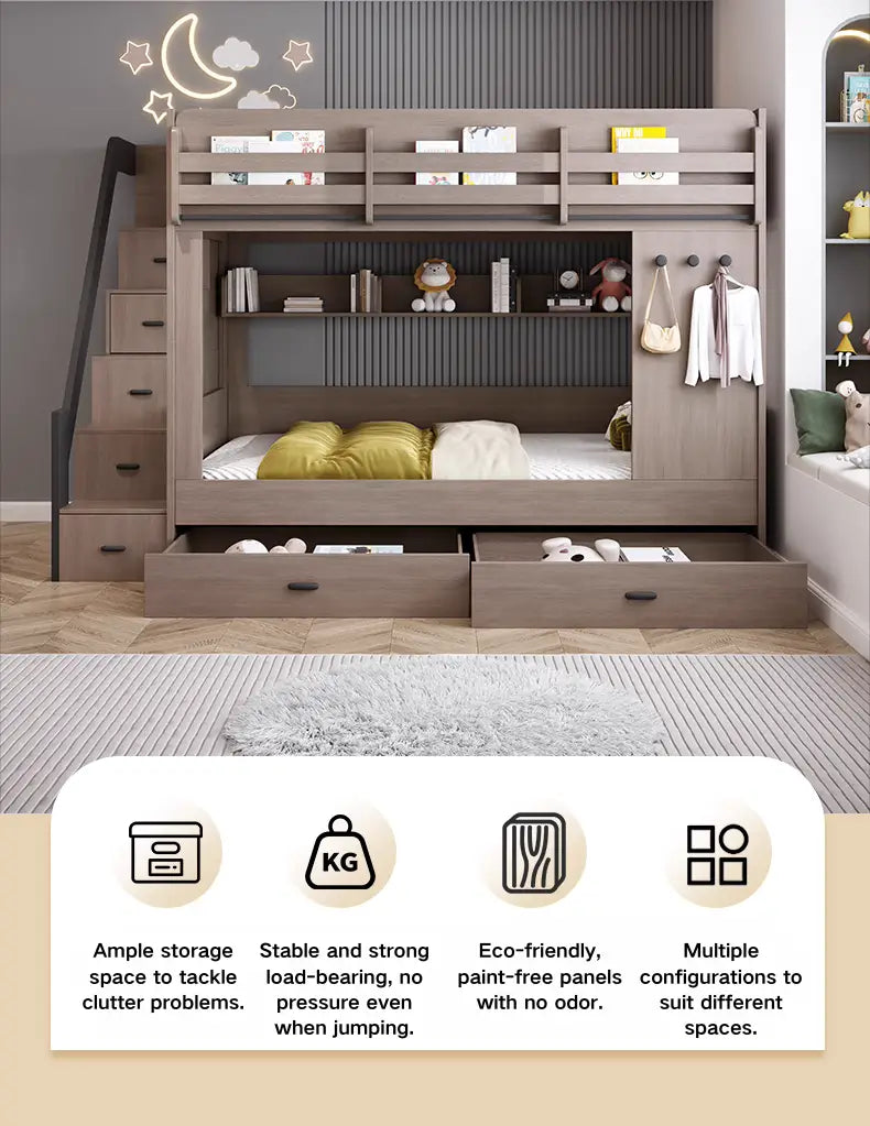 The DreamSteps1 Loft Bed with Storage Staircase is the perfect space‑saving solution for families, offering a double bed on both the top and bottom for generous, equal‑width sleeping space.